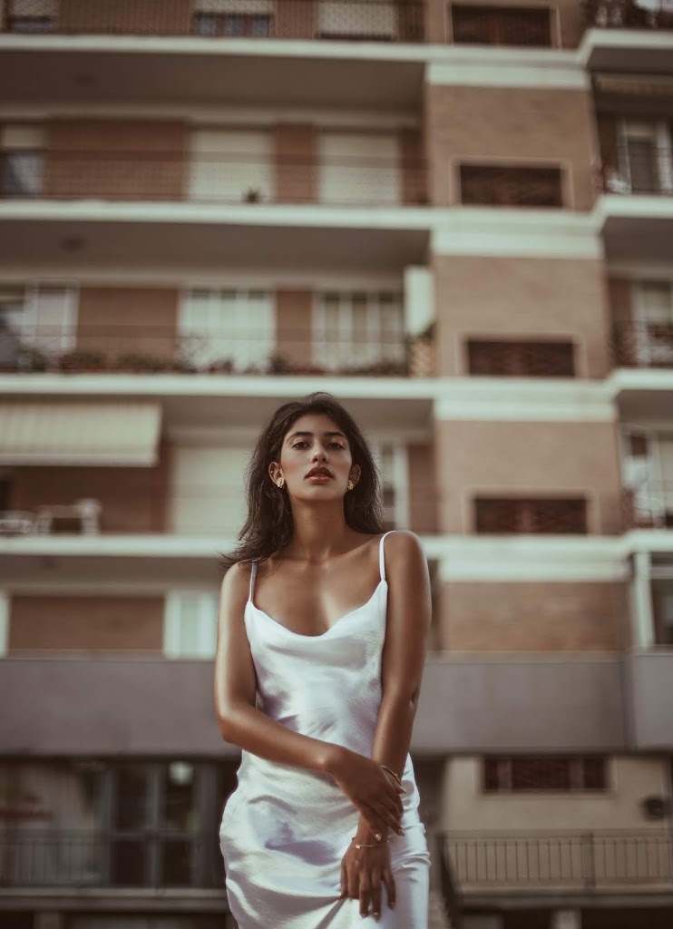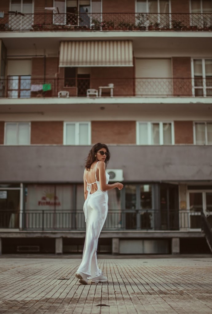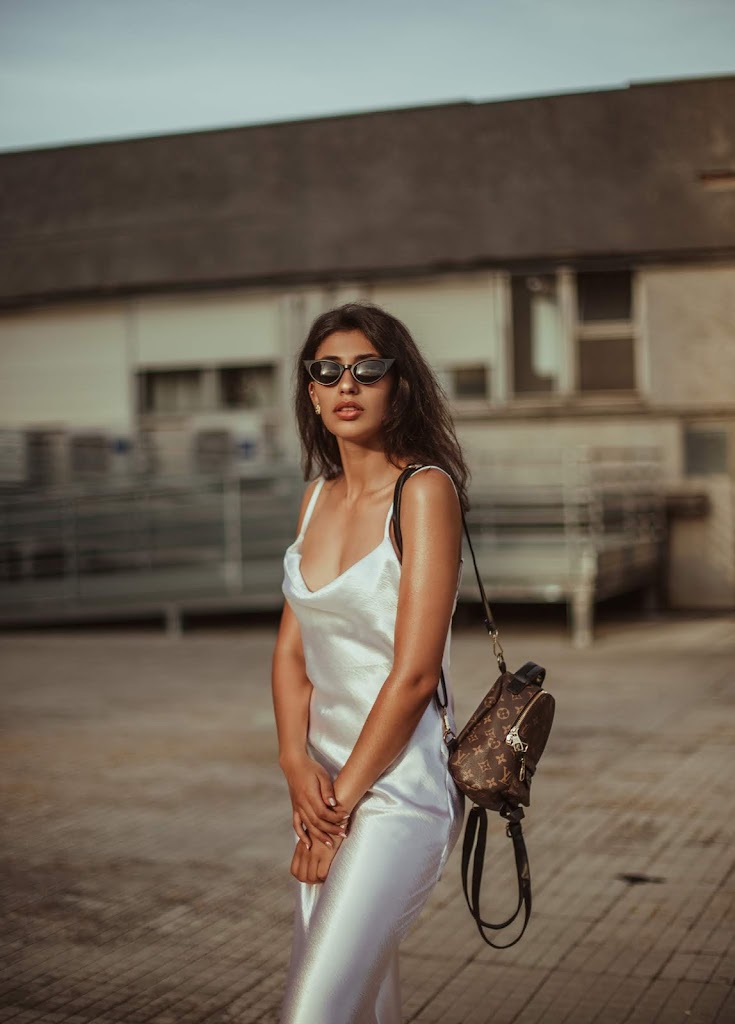 Il mini zaino e le snikers con suola carro armato contrastano con la delicatezza candida dell’abito lungo.