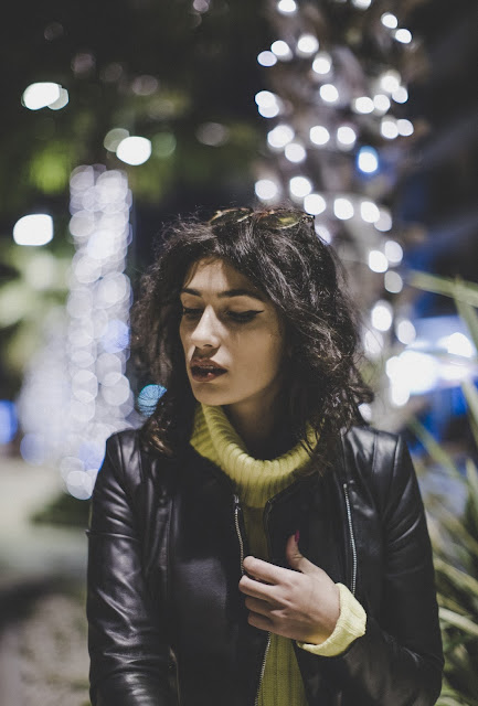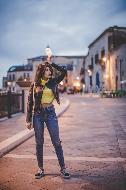 Mi sono munita di un maglioncino a collo alto e bello pesante di colore giallo fluo, jeans a vita alta per coprire lo stomaco (non è proprio periodo di ombelico scoperto!) ed una bella giacca di eco-pelle.